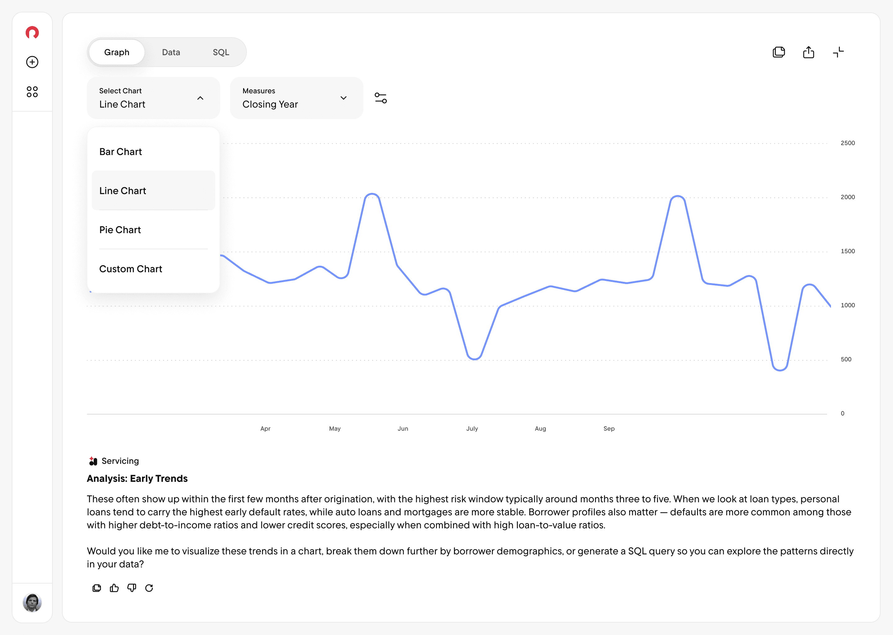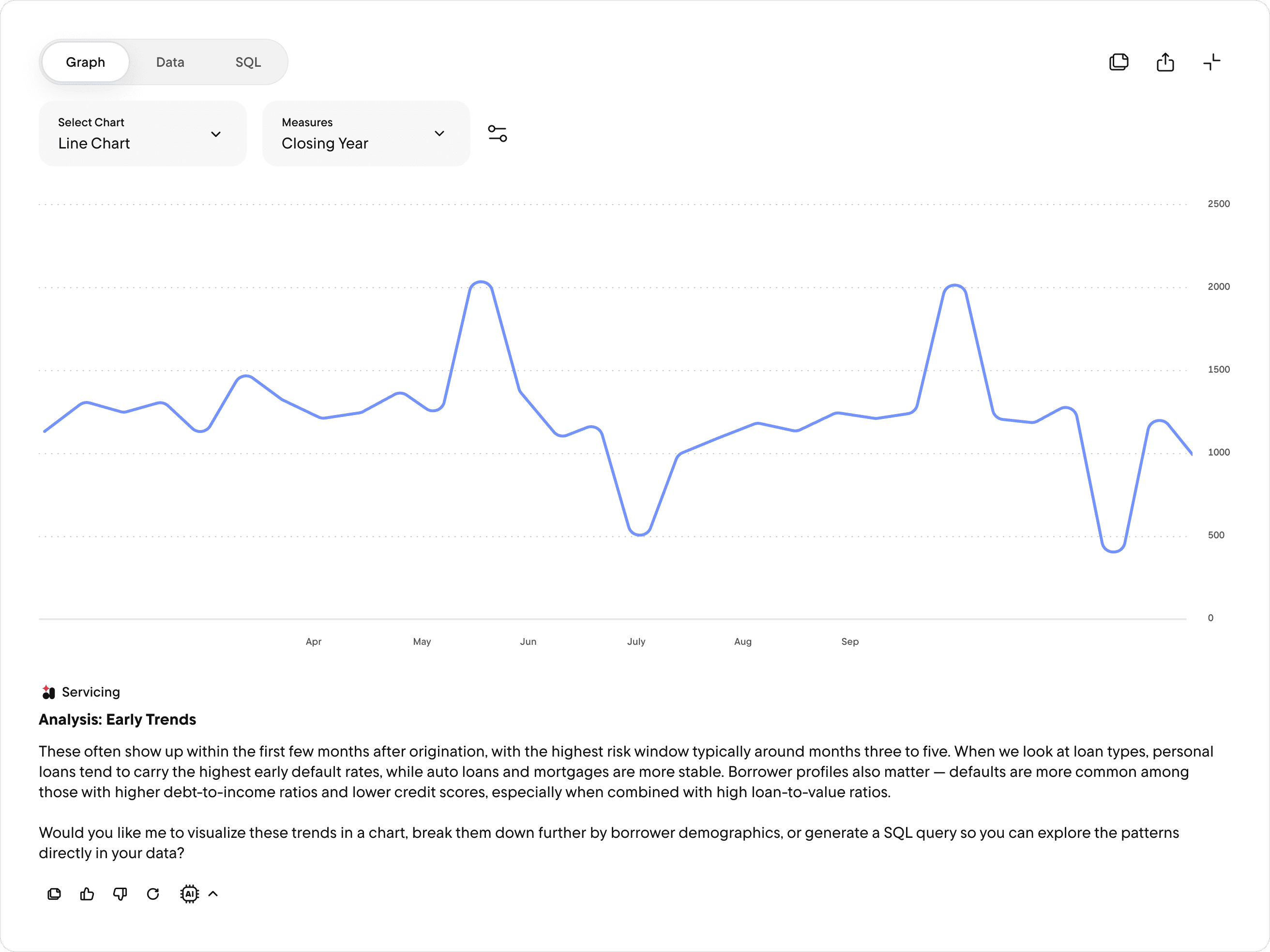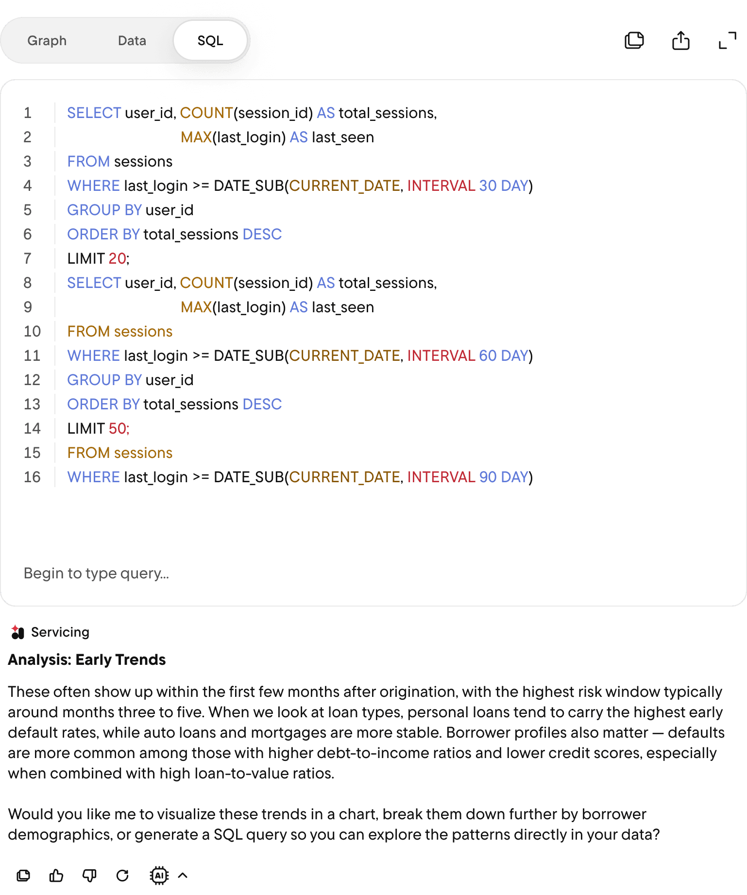 Restructured how Rocket Analytics surfaces SQL code, data tables, and graph visualizations โ giving users clear control over which format they see and why each option exists.