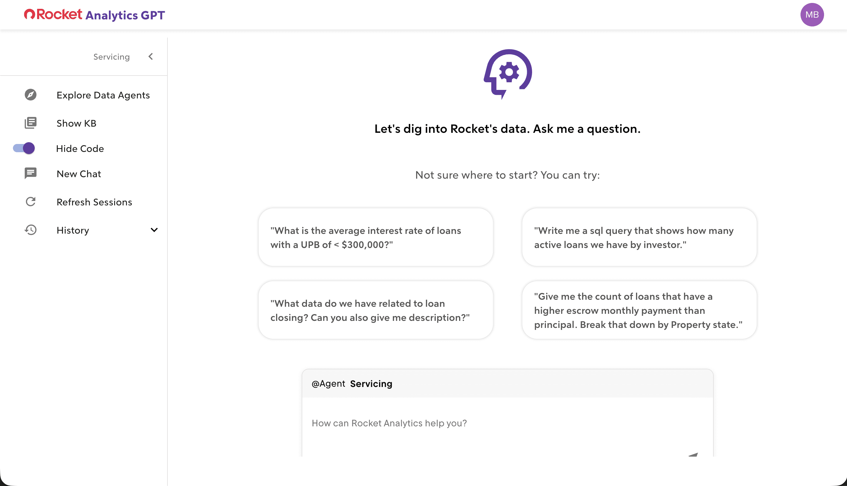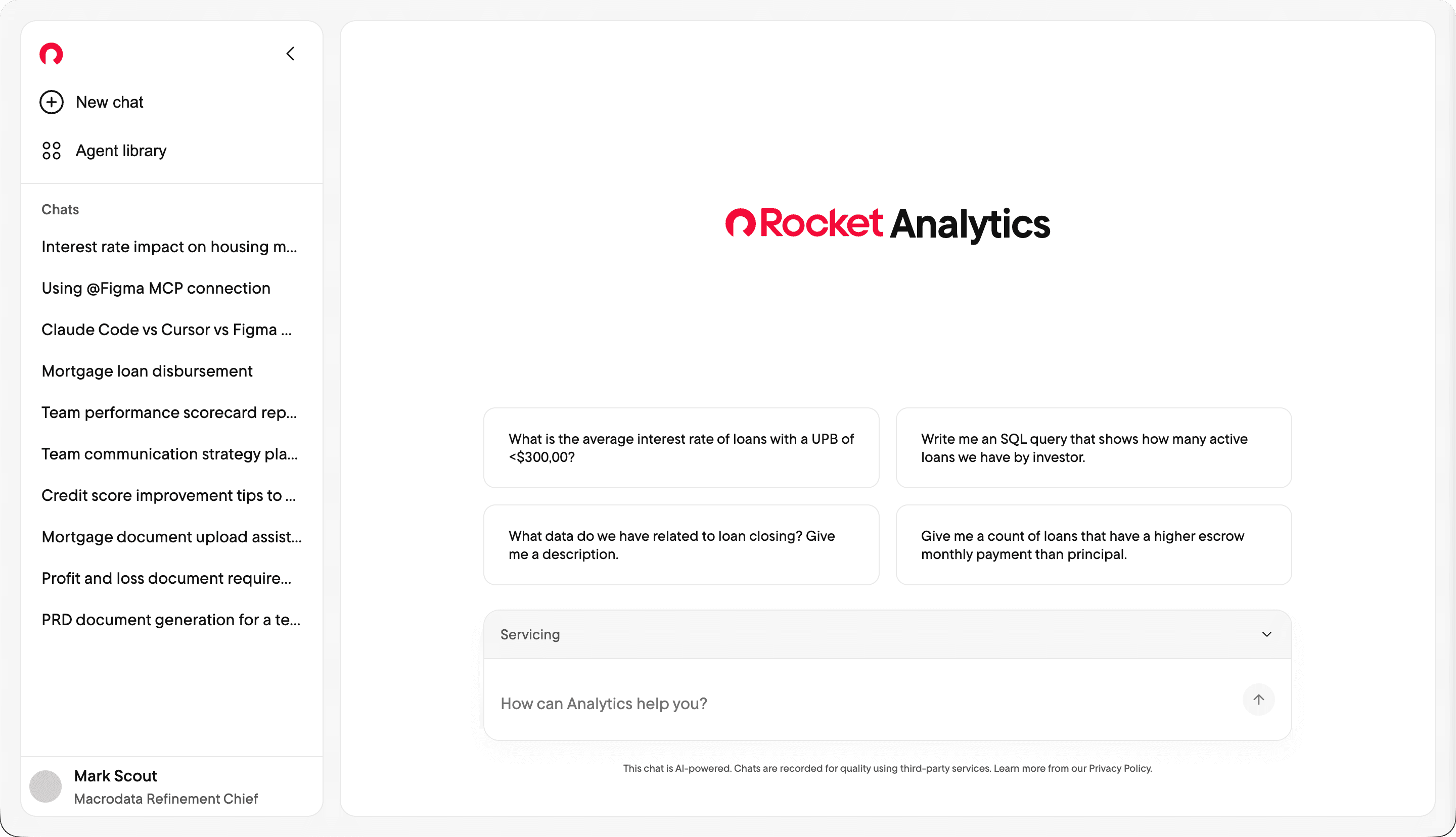 Rocket Analytics is an internal AI platform for Rocket Mortgage bankers and executives โ a ChatGPT-like experience purpose-built for lead analytics, team metrics, and data visualizations. Users can query their data conversationally, customize AI agents to automate recurring analyses, and share insights across teams.