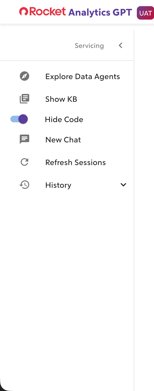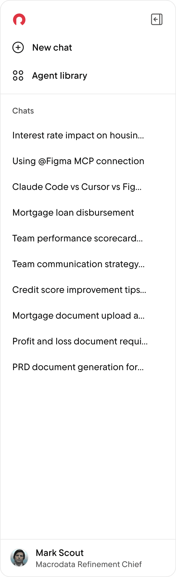 The sidebar now follows the mental model set by ChatGPT and other modern AI tools: a persistent list of past conversations, clearly labeled, with the ability to start a new chat prominently displayed. Agent switching is moved to a context-appropriate location within the conversation view.